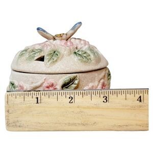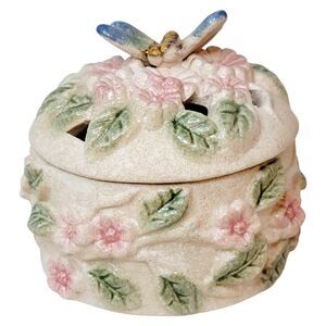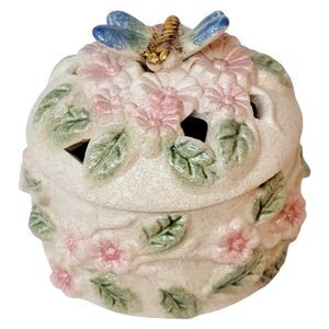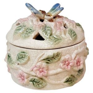 Vintage Potpourri Trinket Box Lidded Jewelry Box With Dragon Fly Floral