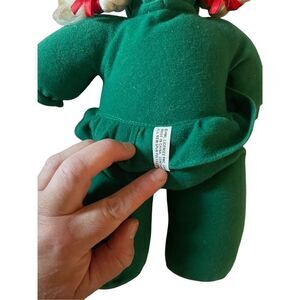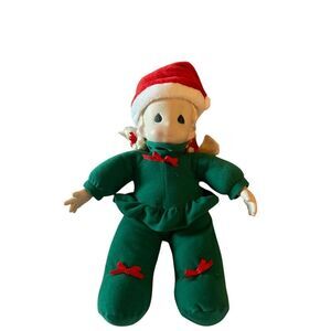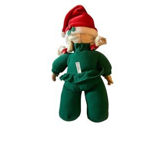 • The doll is wearing a green suit with green ruffles around the neck, a red ribbon under the ruffle, and a Santa hat.