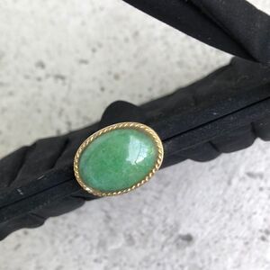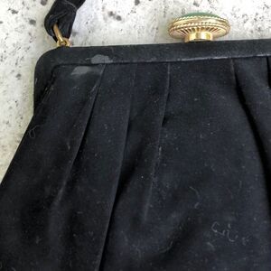 This is a sweet evening bag. When you look at the pictures please look closely the exterior needs a little bit of cleanup on the front and the back has a small mark on the top. The closure looks like a jade stone circled in gold and silver. Inside is super clean. An iPhone fits in it easily. I’m not sure of the material. It’s like a rubbed suede or a hard velvet. Measure across the bottom is 9” x 7 1/2 by approximately two.