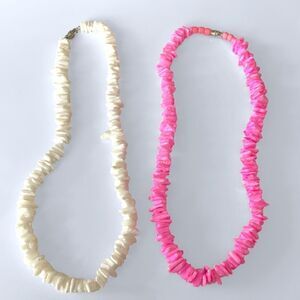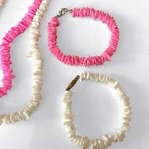 Vintage pink and white Puka Shell jewelry. Includes two necklaces and two bracelets.