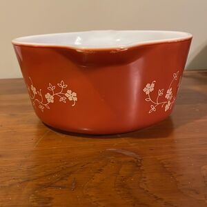 This Vintage Pyrex 474-B Orange with White Flowers Bouquet Casserole 1.5 Quart is a great looking dish. Made for the microwave or oven or even a nice shelf for display. Dish has some wear due to age and use but is still a great piece.