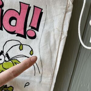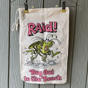 vintage advertising, 80s promo, retro cartoon, novelty collectible, kitsch decor, pop culture, quirky storage, nostalgia gift, RAID bug mascot, drawstring tote, beach bag, canvas sack, ironic fashion, funny gift idea, old-school branding, promotional merchandise, cartoon bug print, bug out bag, vintage ephemera, novelty accessory.
