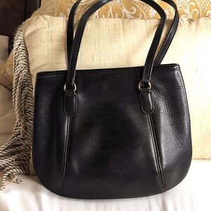 Vintage Coach bag in black glove tanned leather, tight clasp snap closure is brass hinged ( this is rare for Coach bags ) beautiful stitching!