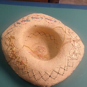 Chic straw hat featuring colorful floral embroidery. Perfect for sunny days.