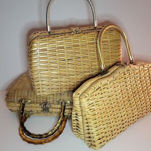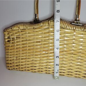 Gorgeous vintage woven rattan purse is in excellent condition. Enjoy the nostalgia of the 50's in this beautiful and sturdy oblong tote with one main interior compartment. Inside vinyl lining is in nice condition, too. See other vintage rattan bags available in my closet.