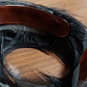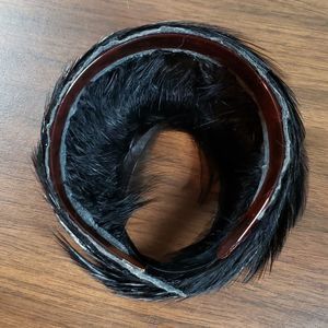 Its a plastic head/hair band covered in super deep black feathers. From a Raven? A Crow? A Mynah? I dunno...they don't say. But they are real feathers.