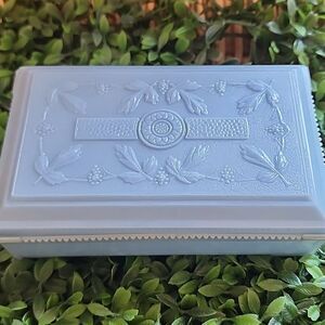 love the intricate detail on this piece, featuring leaves and grapes on the lid with a flower medallion in the center.  The bottom portion features feet and a dental edge, making it easy to lift open the lid