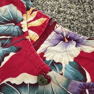 Vintage wide leg red floral print jumpsuit. Short sleeve, slightly cropped length. Back zipper. Non stretch, mock heart buttons. Wide leg.