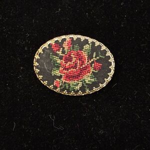 This exquisite Vintage brooch showcases a beautifully embroidered red rose set against a dark background, framed by a scalloped brass-toned border. The intricate needlework highlights the delicate petals and green foliage, offering a romantic, Victorian-inspired aesthetic.