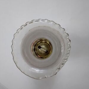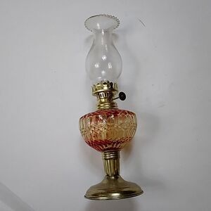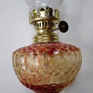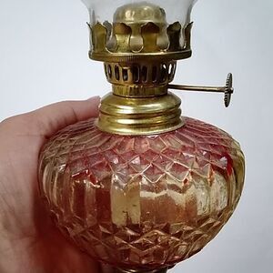 I think the red that you’re seeing is old red lamp oil residue left in the lamp after use. It should be clear glass…