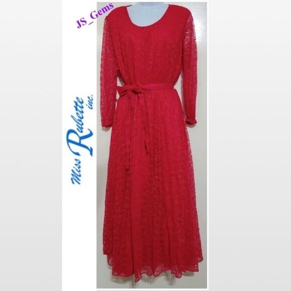 Miss Rubette inc. luxury red floral lace vintage full length dress. Features 70.5”L matching belt, 21” back zipper, thin banded wrists, & silky type lining. Approx. arm pit to arm pit 20”, 17” waist, arm 20”, & 50”T. Belt might need a light iron. Ask any questions before purchasing. Enjoy buying from an Ambassador II. Same or Next Day Shipping 🎁 Make an Offer or bundle to Save 😊💕 All sales final & sold as is