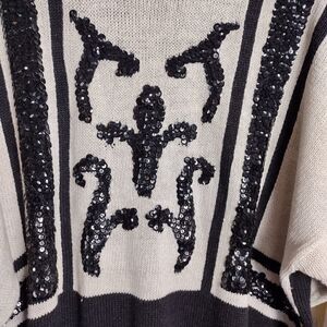 black and cream, sequined sweater, shoulder pads. Ramie, cotton blend. pit to pit 27" length 33"