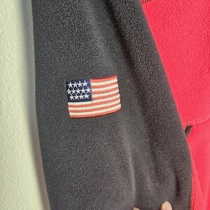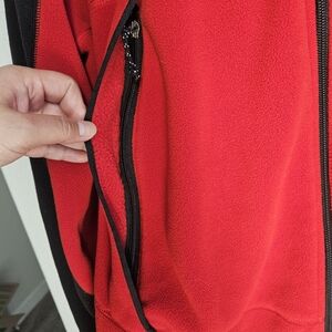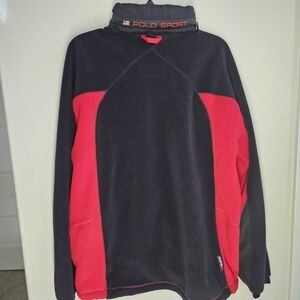 Stylish red and black fleece jacket by Polo Sport. Features a zip-up front and side pockets.