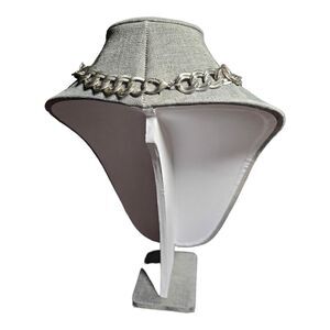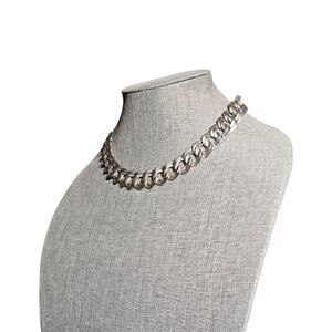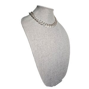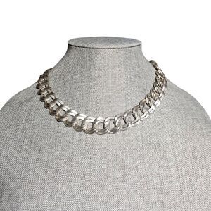 This exquisite Vintage Retro Silver-tone Double Link Collar Necklace is a statement piece that radiates timeless elegance. Crafted with meticulous attention to detail, the necklace features a series of double links that interlock in a harmonious sequence, creating a fluid and tactile texture. Each link is polished to a high shine, reflecting light with every movement, ensuring that it catches the eye. Its substantial collar length makes it a versatile adornment, suitable for both high-neck and open-neck outfits, adding a touch of sophistication to any ensemble. The robust construction hints at the durability and quality of retro jewelry-making. This piece is not just an accessory; it's a slice of history that sits comfortably at the base of the neck, promising to be as enduring as its design. Whether you're dressing up for a special event or adding a dash of glamour to your everyday wear, this necklace is sure to become a cherished addition to any vintage lover’s collection. Length: 18" Condition: Preowned. In excellent conditon as pictured.