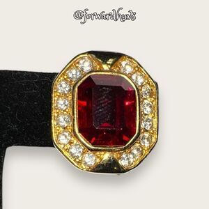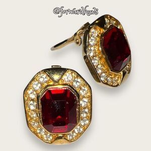 These vintage gold-tone clip-on non-pierced earrings are truly stunning. Each earring features a striking design centered around a vibrant red rhinestone, adding a bold touch of color and elegance.