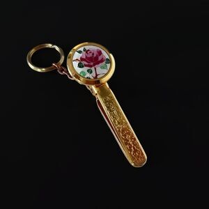 Vintage gold tone etched enamel rose flower key finder clip keychain. 2.5” length