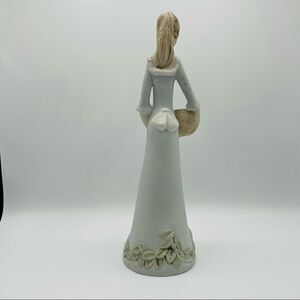 This amazing vintage figurine is in excellent condition. There are no chips or cracks. The figurine is stretched tall and she’s holding a basket. There is a garden of leaves around the bottom of her dress. I believe it’s hand painted. It is marked on the bottom. It’s approximately. 12” tall.