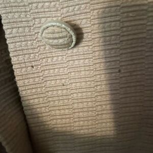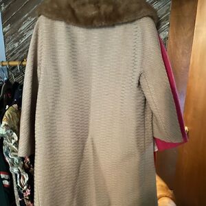 Unknown if fur is real or faux. There are some small spots on coat see pics. They are not very noticeable. They may come out of dry cleaned. Size is best for a medium/large. No size on coat. No other significant flaws however this is a vintage piece and may have some flaws due to age of the garment