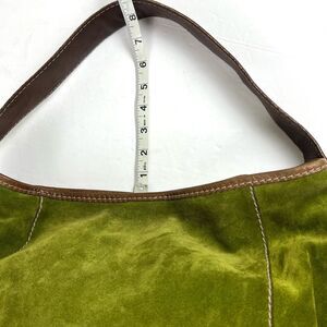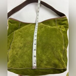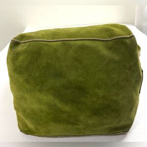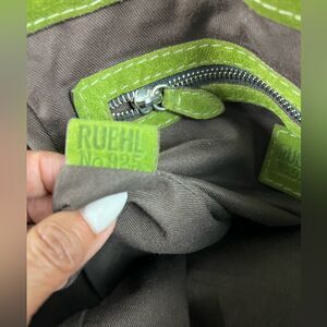 In good Vintage condition Ruehl No. 925 suede tote. Stylish green and brown women's bag perfect for any occasion. Features a spacious interior and durable design. Please look at photos for measurements and last two photos for minor wear. Bag features 1 single leather strap and top magnetic closure. Inside bag has 2 open slots, 1 zip pocket and a key fob.
