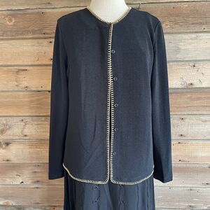 Stylish matching cardigan sweater and dress in excellent preowned condition. The sweater measures 21 inches armpit to armpit laying flat and 25 inches in length from shoulder to hem. The dress measures 20 inches armpit to armpit and is 54 inches in length.