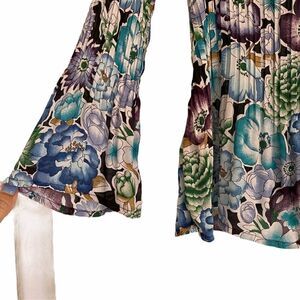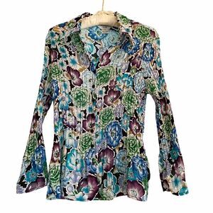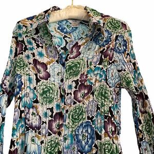 Beautiful blooms in green, blue, purple and gold on a lightweight polyester fabric with accordion pleating. Great preowned condition- no flaws- like new.