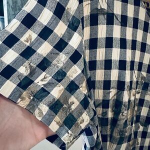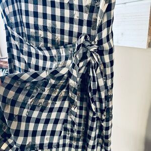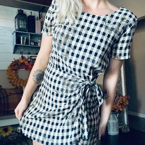 In good gently used condition. This piece is a 80s vintage beauty! Black and cream checkered print with faint floral overlay throughout. Shoulders are padded and has adorable little front layered piece that ties on one side. Makes this fit so flattering! Zips partially up the back. There is a bit of discoloration on the brand tag and some spots on the sleeves where you can see stitching on the outside as shown. Not noticeable unless really looking for it. Has edgy small slit on the back hem. Size 10