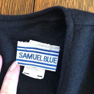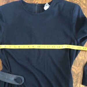 Gorgeous wool blend long sleeve dress with a leather or faux leather belt detail. The skirt under the belt is pleated/gathered and falls to a faux wrap look. The neckline is rounded, with hidden zipper in back. It is unlined, and in excellent condition. Please check measurements. This is listed as a 14, but seems more like an 8 or 10. Width at bust 18.5” seam to seam laying flat. Waist 16”. Hip 18”. Sleeve 21”. Length 44”.