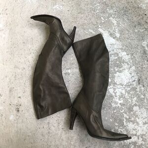 Is 1980 boots are in very good condition except for one toe has the scuff across the top, polished out it wouldn't even show problem. I've never noticed it till I went to photograph. The curve in the shaft is what gives it the slouch. It's a bronzy metallic finish on leather boots with leather soles