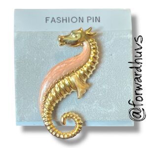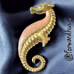 This beautifully detailed vintage seahorse brooch measures approximately 2 1/2 inches in length and features a graceful silhouette in coral-colored enamel over gold tone metal. The design captures the natural curves and texture of a seahorse, complete with a curled tail and raised ridges that add depth and dimension.
