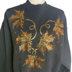 Vintage Sequin Pullover Crewneck Sweatshirt L Black Fleece Autumn Leaves Fall