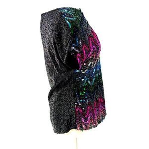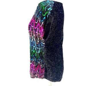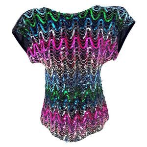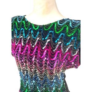 Vintage Sequin Zigzag Blouse Disco Glam Party Top 80s Shoulder Pads Rainbow M