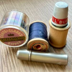 Vintage wooden thread spools, needle storage, old zipper and thimble