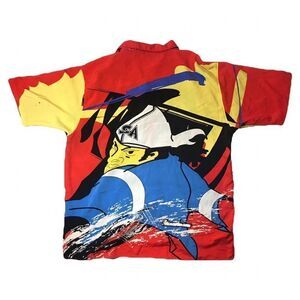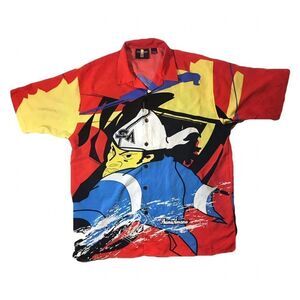 Silk button up, crazy graphic all over, small staining on back left sleeve as shown, hard to notice due to the graphic