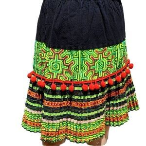 Vintage Short Pleated Skirt XS to S Hmong Ribbon Embroidery Pompoms
