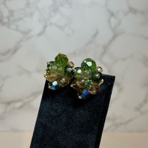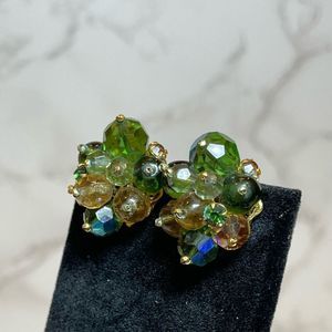 Vintage Signed DeMario NY Green Glass Beaded Rhinestone AB Clip On Earrings