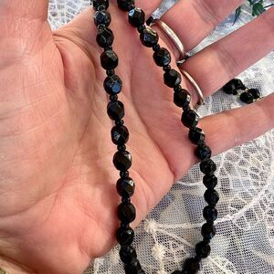 Lovely old mid-century piece by Monet. Black faceted lucite/acrylic beads with black seed beads as spacers. 23”. Strung on black silk cord.