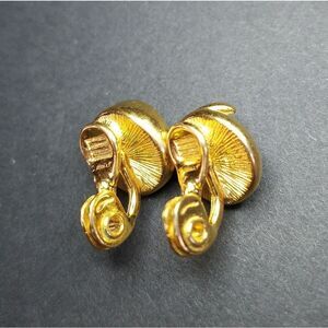 Classy Monet clip-on Pearl Stud earrings set in gold-tone metal. There is a classic styling in the swirl of metal around the pearl. Simple yet beautiful. Looks to have come from the 1960's but I do not know for sure. The front of the earring measures approximately 1/2" across. Could be worn as a cuff earring for a more modern look higher on the ear, but it is very beautiful as a classic style.