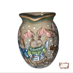 Vintage Signed Artist Hand Painted Ceramic Bunny Christmas Caroler’s Pitcher