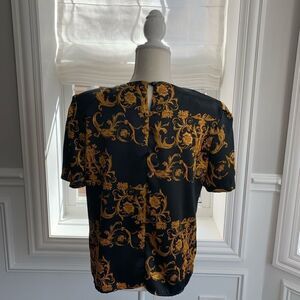 Vintage silky blouse in size small. Black with gold paisley print. One button closure in back (note wear to ring). Side slits. No stains or holes. Measurements laying flat are as follows: