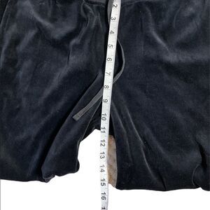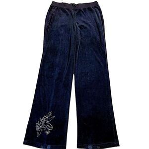 Vintage iActive Black Velour pants embellished with gold and silver print and embroidery flower on right leg. Contrasting ribbed Drawstring waist . Leg is straight but not narrow