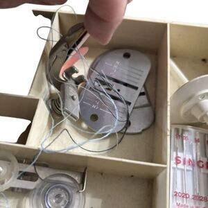 Vintage Singer Sewing Machine Accessory Box And Cams. Top removable drawer has miscellaneous accessories. Bottom compartment has cam #’s 1,3,6,8,9,10,12,18,51,52,54,56,57,59.