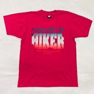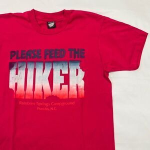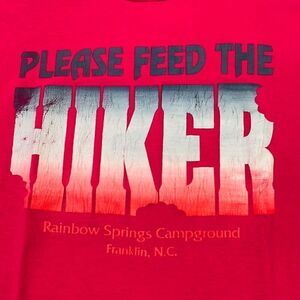 Vintage Single Stitch “Please Feed The Hiker” Hiking Tee. Screen Stars Best Tag. 50% Cotton 50% Polyester. Rainbow Springs Campground Franklin, N.C. Single Stitch Top/Bottom. Great Condition 8/10. Graphic has cracking. Awesome Nature/Outdoors Tee. Size Large.