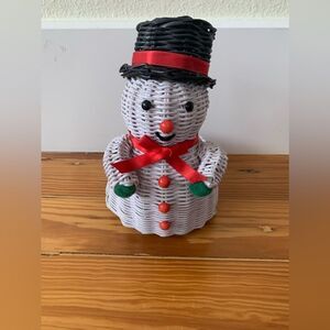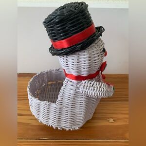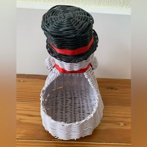 Lightly used. Snowman holiday/Christmas basket. Great for holding/displaying candy canes. Measurements included.