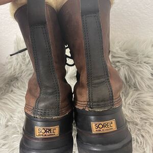 Bighorn, Kaufman Soren’s, made in Canada. Used and Fabulous with a lot of life left. Dark brownWhen it’s time to work or play in the cold and wet weather, these boots are for you. What adventures will you take them on next? Leather upper, shearling inside, no insoles, and missing one silver loop. See photo. Says 10 on bottom of sole but more like 11.