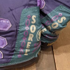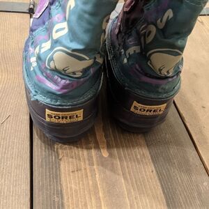 Vintage Sorel Women's winter snow boots. Size 5. Good condition. Tall winter rubber duck boot style. No rips or holes. Original felt liners in very good condition. Nylon shaft with cinch. All cinch still work. Great 80s vintage style with freestyle in graffiti print across the back.