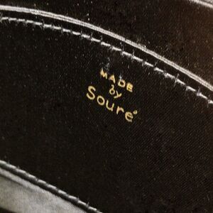 A few beads in (placed singly near the top of the clutch flap) are missing, but difficult to notice since the beads are (were) transparent, and the white thread still remains. The faux pearls are mildly yellowed.