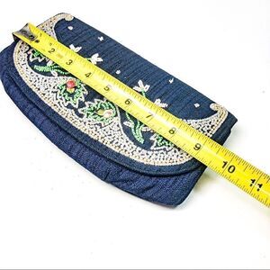 1950’s vintage beaded clutch by Souré. Pale pink, pastel green, crystal, and faux pearl beads embroidered on a deep blue woven and lightly reflective linen. Blue satin lining, leather slot card holder, snap closure.