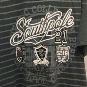 Vintage black and grey striped South Pole t-shirt. Says 5XL fits like 2XL In very good condition, no major flaws. See photos for details. W 25" L 30"