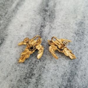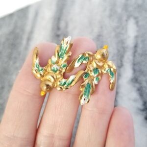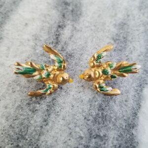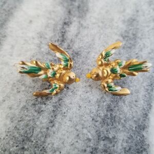 Vintage Sparrow Clip On Earrings, Gold Tone and Green Enamel, Screw Backs