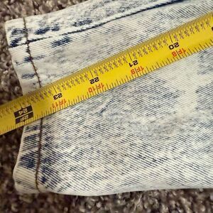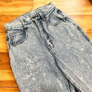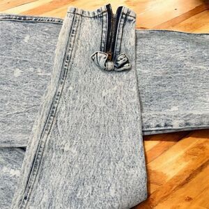 Vintage Sports Fever acid wash high waisted rise slim leg jeans. Zippers and bows at the hems in back.